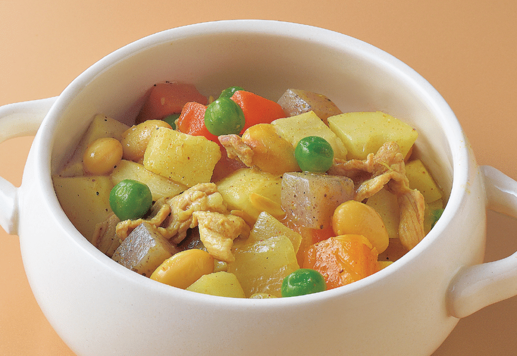 1)なべに油を熱して豚肉、玉ねぎ、にんじん、里芋の順に加えていため合わせ、栄養だし(粉末だし)と分量の水、大豆、こんにゃくを加えて煮る。